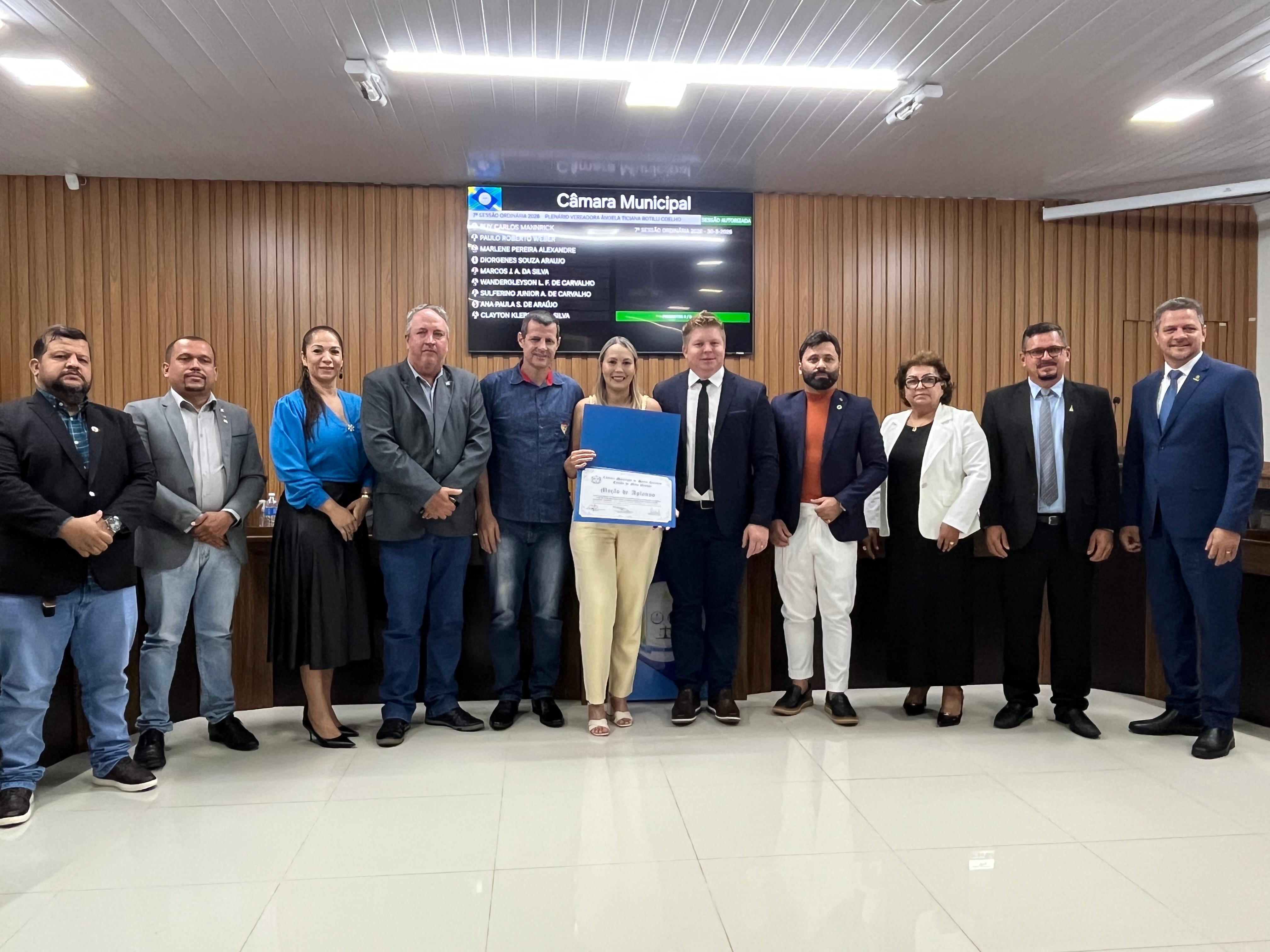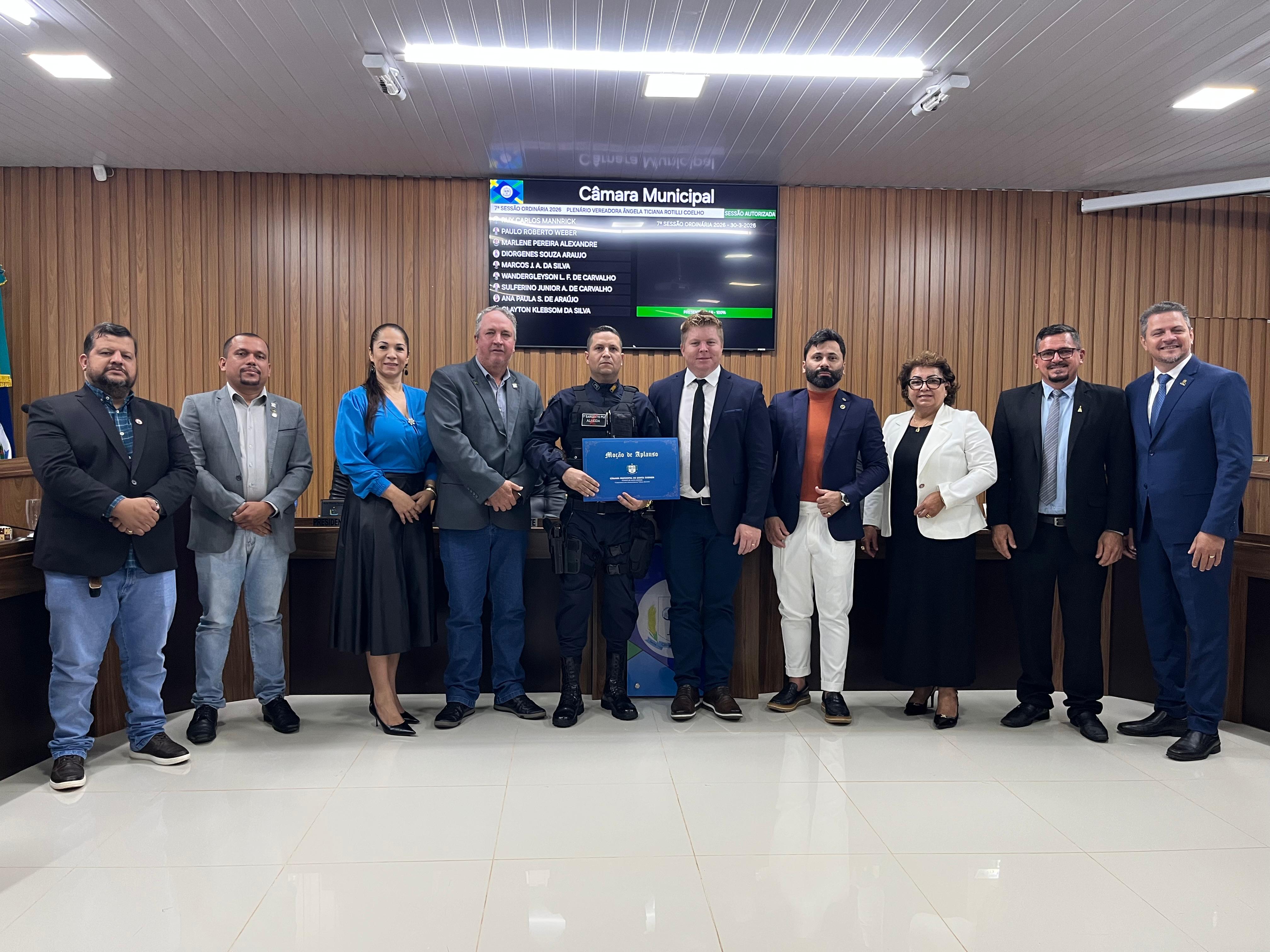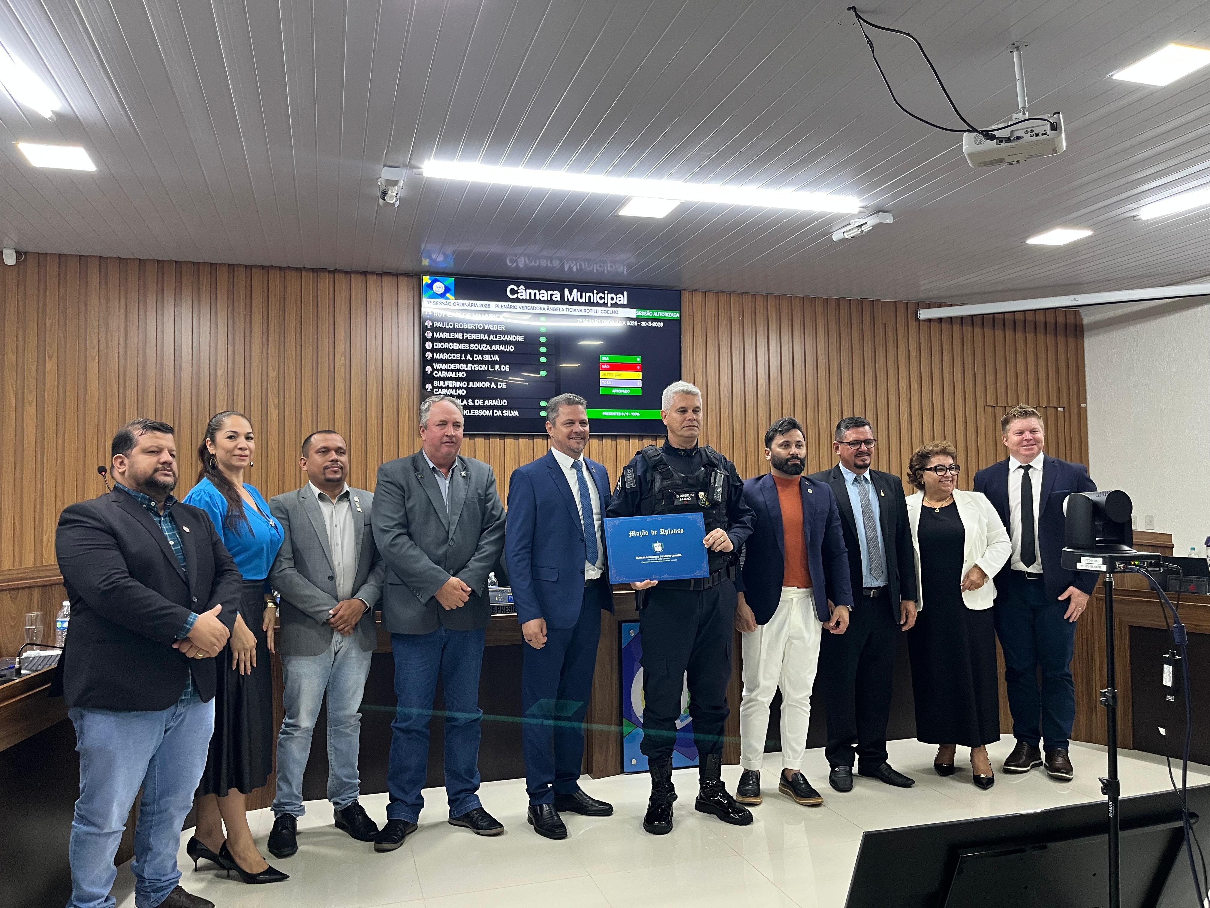 Foi discutida em seguida a Moção de Aplausos Nº003/2026 também apresentada pelos vereadores Diorgene, Ana Paula e Paulo na qual: “Manifesta Moção de Aplauso ao 1º Sargento PM André Almeida de Souza, Comandante do Núcleo de Polícia Militar (NPM) de Santa Carmem/MT, pelos relevantes serviços prestados à segurança pública e à comunidade de santa Carmem-MT”.